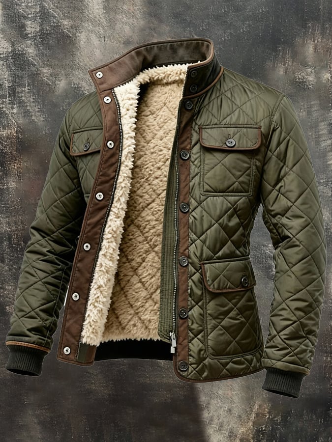 Men's Retro Quilted Fleece-Lined Warm Zip-Up Jacket